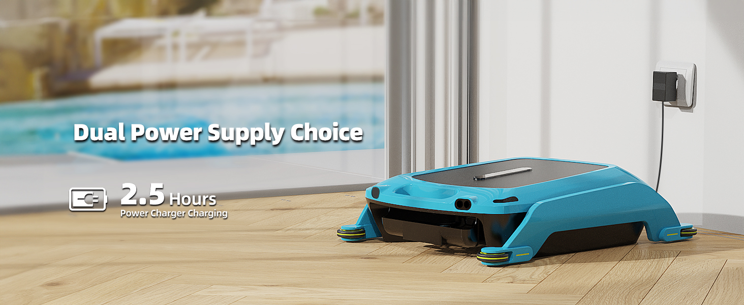 Additionally, the SR5 solar powered pool skimmer boasts dual-charging options that include solar power, allowing for continuous operation and enhanced battery life. A quick, 2.5-hour charge ensures smooth operation regardless of the weather. For durability in direct sunlight, the SR5 is equipped with a UV-resistant coating. An extra power adapter further complements the uninterrupted charging capability during rainy or cloudy days.